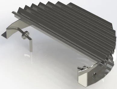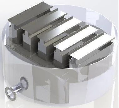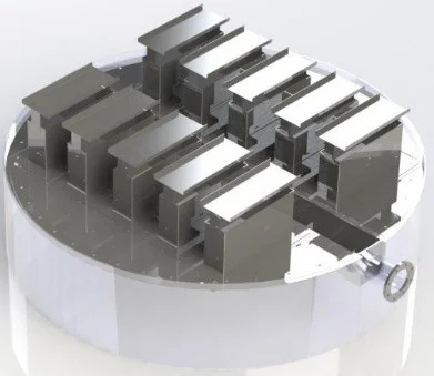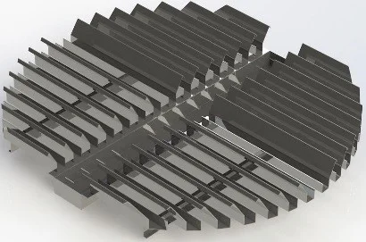 Chevron type liquid collector with center trough. Liquid is collected by the chevron shaped plate, and then flows into the center trough.