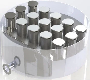 Liquid collector with capped round risers for gas distribution and liquid collection. Liquid is drawn out from a side sump.