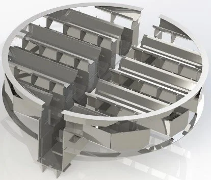 Chevron type liquid collector with annular trough. Liquid is collected by the chevron shaped plate, and then flows into the annular trough. Incoming feed from outside the column may be introduced into the annular trough directly for better mixing